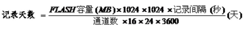 5、记录时间:各通道记录时间的长短与FLASH存储器容量、输入点数及该通道的记录间隔有关,计算公式如下: